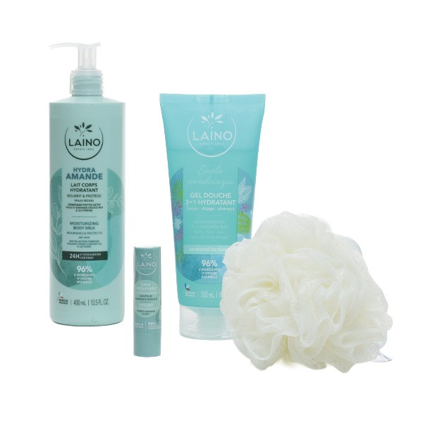 Le Gel douche Escale Paradisiaque nettoie en douceur le corps, le visage et les cheveux, et laisse sur la peau un parfum délicat. Le Lait Corps Hydratant Amande douce nourrit à fond les peaux sèches et les rend souples et confortables dès qu'on l'applique. Et le Stick Lèvres Amande douce protège et répare les lèvres abîmées, en laissant un fini doux. Ces soins sont fabriqués en France, et ils montrent tout le savoir-faire de Laino pour une beauté simple, naturelle et agréable.