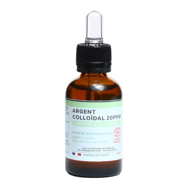 L’argent colloïdal, contenu dans les gouttes Hygiène des paupières Dr Theiss, est utilisé ici pour participer au nettoyage et à la protection de la zone oculaire. Il s'appuie sur ses qualités antiseptiques et antibactériennes pour purifier la zone.