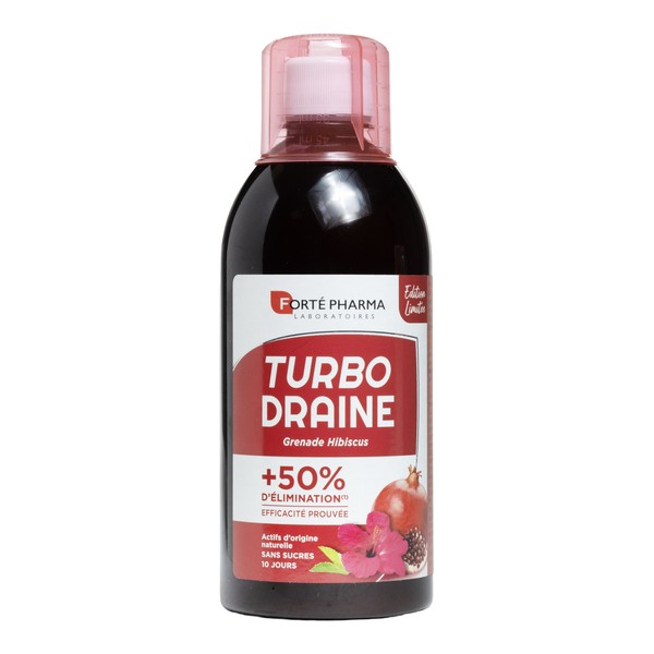 La boisson Turbodraine grenade hibiscus Forté Pharma est complément alimentaire à base d'actifs d'origine naturelle.